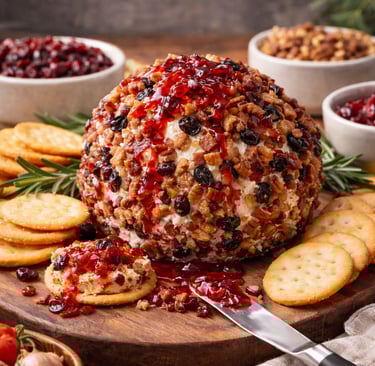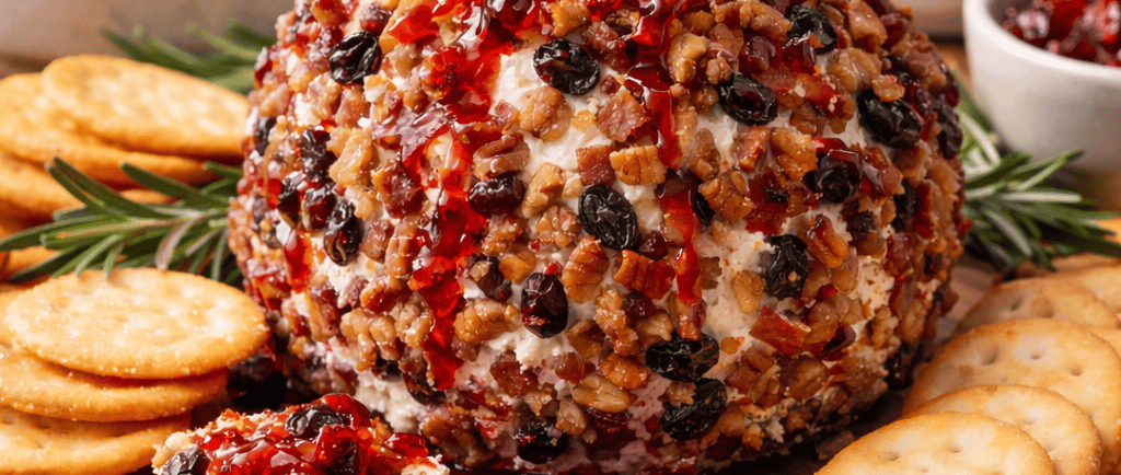 Bola de queso crema con tocino, arándanos, nuez y mermelada
