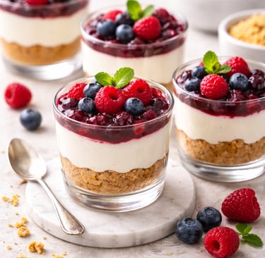 Topping: Cocina los frutos rojos con azúcar, maicena y unas gotas de limón a fuego medio hasta que espesen ligeramente. Deja enfriar y coloca sobre cada vaso antes de servir.