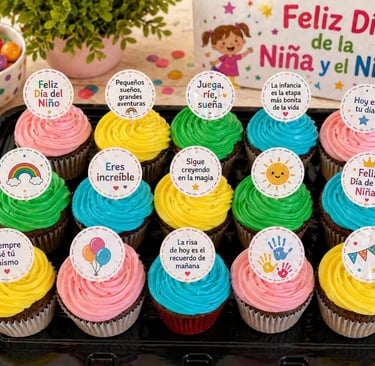 Alterna colores llamativos en cada cupcake (rosa, azul, amarillo, verde).