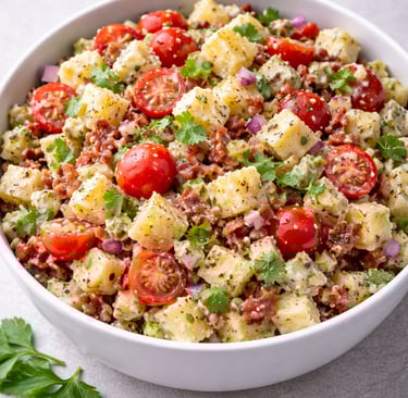 En un Tazon Ensaladera Frutero De Vidrio Sensacion Crisa 1.83 L, colocar las papas doraditas y agregar cebolla morada picada en juliana, tomates Cherri, pimiento verde picado en cuadritos, agregar al gusto: mayonesa, mostaza, cilantro picado y tocino picado.
